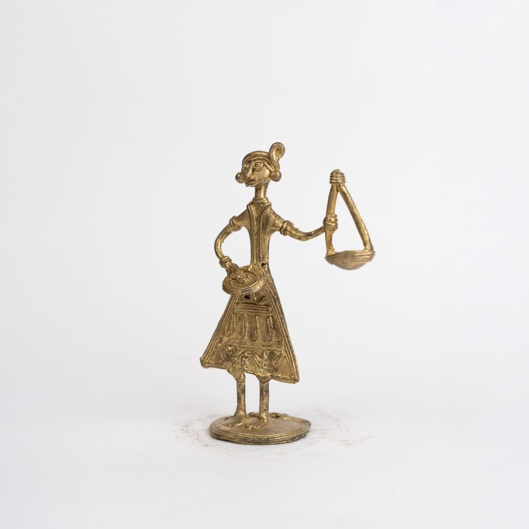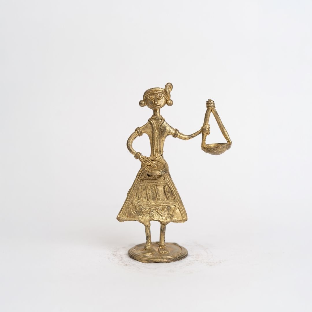 Originating from Bishnupur, this figurine draws from the rich Dokra metalcraft tradition. Bishnupur artisans, known for their lost-wax technique, have passed this craft through generations. The Baul, a symbol of spiritual wandering and musical devotion in Bengal, is immortalized in metal, blending folk storytelling, cultural identity, and artisanal mastery into a single expressive piece.