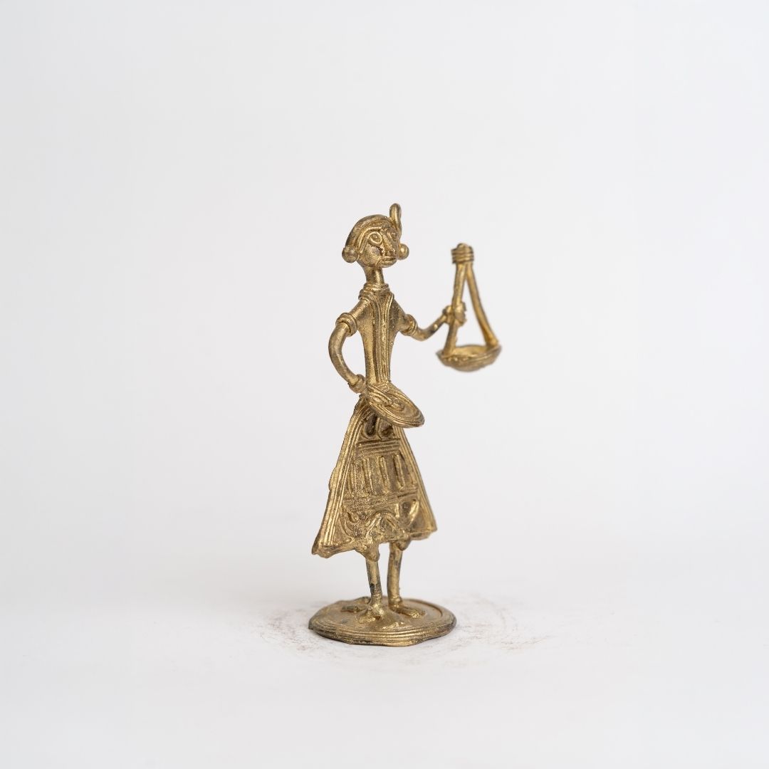 This Dokra showpiece depicts a Baul folk musician, the wandering soul of Bengal’s musical traditions, in a dynamic and expressive posture. Hand-sculpted with attention to detail, the figure captures the musician’s instrument, gestures, and flowing spirit. Its rustic metallic finish and intricate design convey the devotion, melody, and poetry inherent in Bengal’s folk culture.