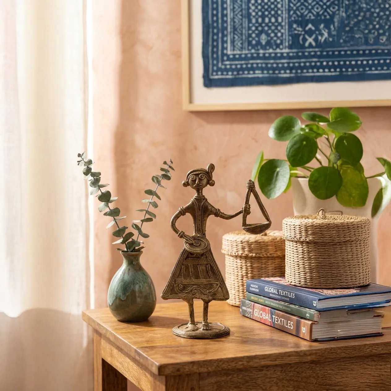 This Baul musician showpiece is unique for its expressive storytelling, cultural symbolism, and artisanal skill. Each handcrafted detail captures music, movement, and spiritual devotion, making every piece one-of-a-kind. It embodies the soul of Bengal’s folk traditions, the artisan’s craftsmanship, and the timeless beauty of Dokra metalwork, celebrating heritage, emotion, and culture.