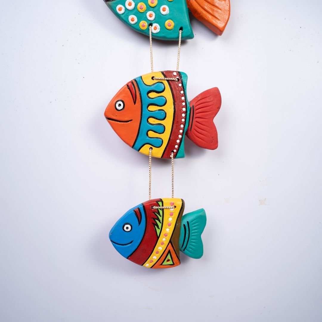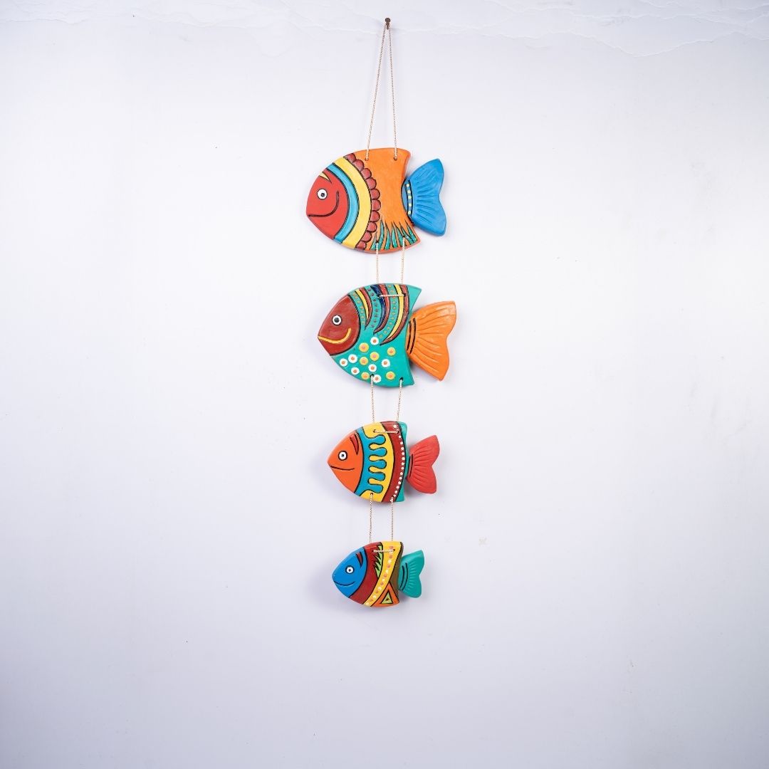 “This wall hanging is a rhythmic assembly of four unique fish, each handcrafted with devotion by master artisans. It isn’t just decor; it’s a testament to the tactile beauty of clay and the vibrant pulse of folk traditions. Every fish is a labor of love, carrying the silent thumbprints of the artist who shaped it.