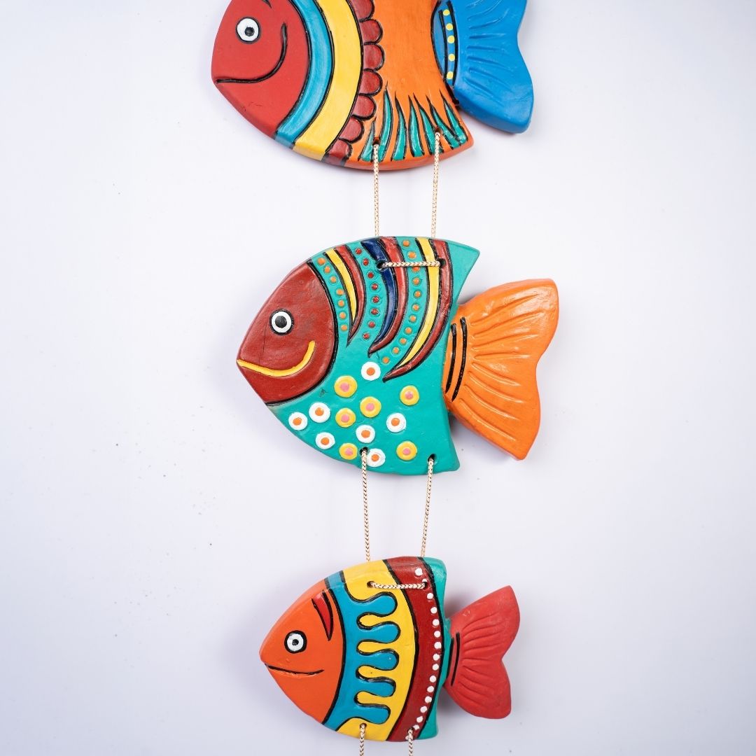 Inspired by traditional Indian terracotta art, the fish boast rounded, whimsical silhouettes with exaggerated fins and expressive, wide eyes. The art style blends elements of folk storytelling with functional home decor. The use of natural clay and jute rope creates a sustainable, earthy aesthetic that feels grounded yet spirited.