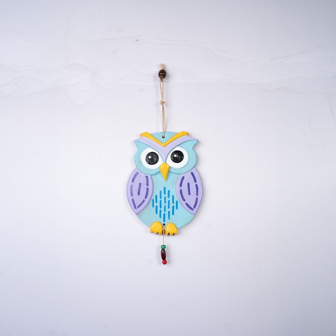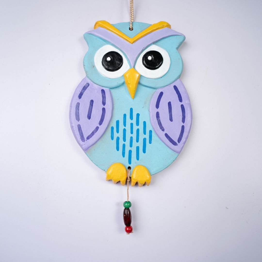 The artistry showcases the meticulous detail of Indian folk-style painting. The owl’s chest and wings are adorned with dark blue dashed patterns, creating a sense of texture and movement. Its inquisitive eyes are sculpted with depth, providing a lifelike presence. The hanging is finished with colorful beads on a rustic cord, adding a tactile, earth-bound rhythm to the vertical design.