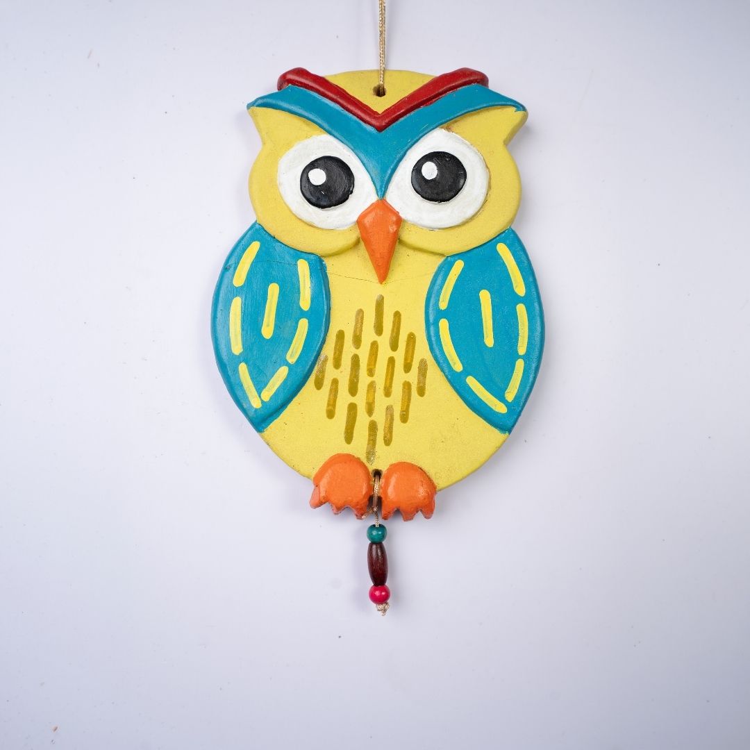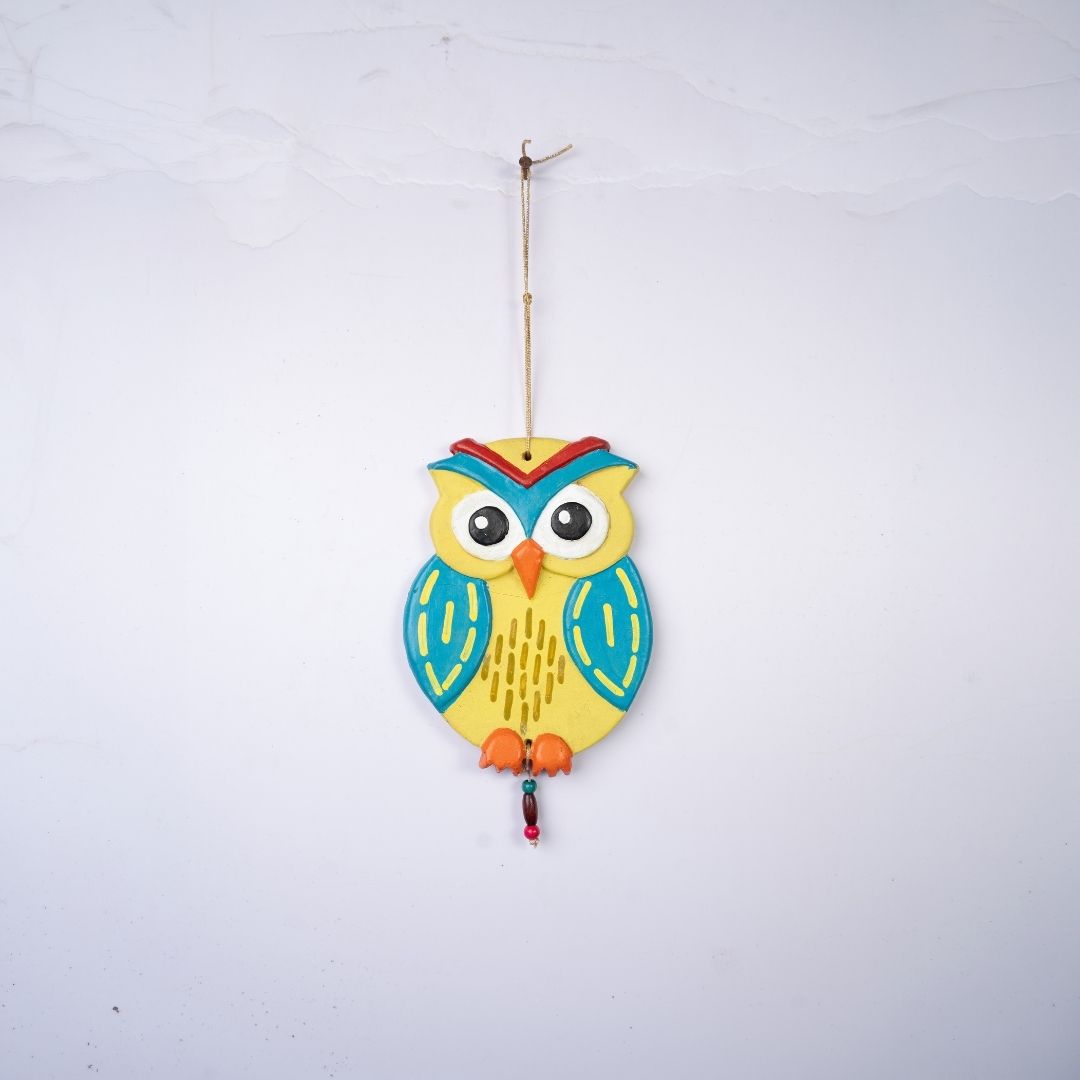 The hanging features a charming, rounded owl silhouette, with exaggerated, wide eyes that seem to watch over the room with benevolent wisdom. Its compact, organic form is topped with a decorative red and blue brow, while tiny orange talons at the base provide a playful, lifelike touch.