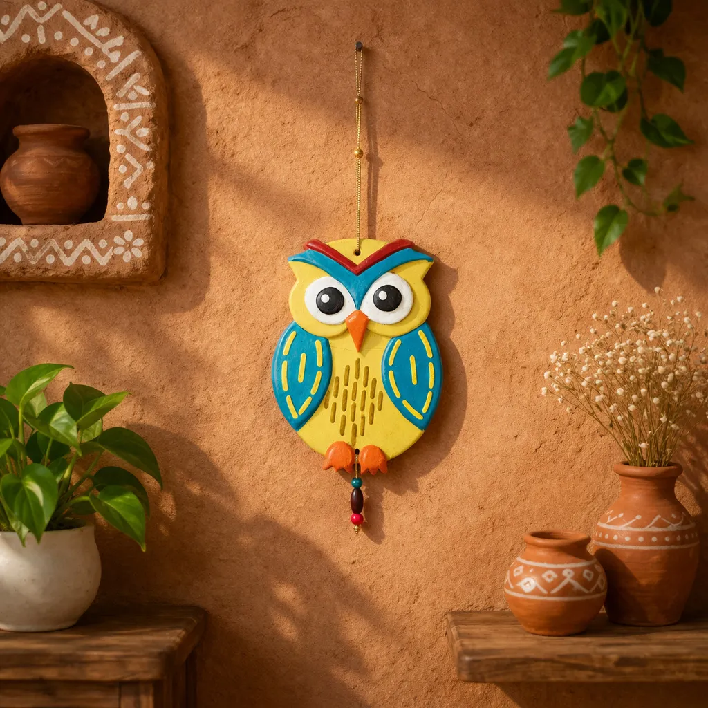 “Born from the sacred soil and the rhythmic pulse of rural workshops, this Amber Owl Wall Hanging is a labor of love. Every curve is shaped by an artisan’s steady hands, reflecting a deep-seated passion for transforming humble clay into a guardian of the home. It is a piece that breathes life and ancient stories into your modern sanctuary.