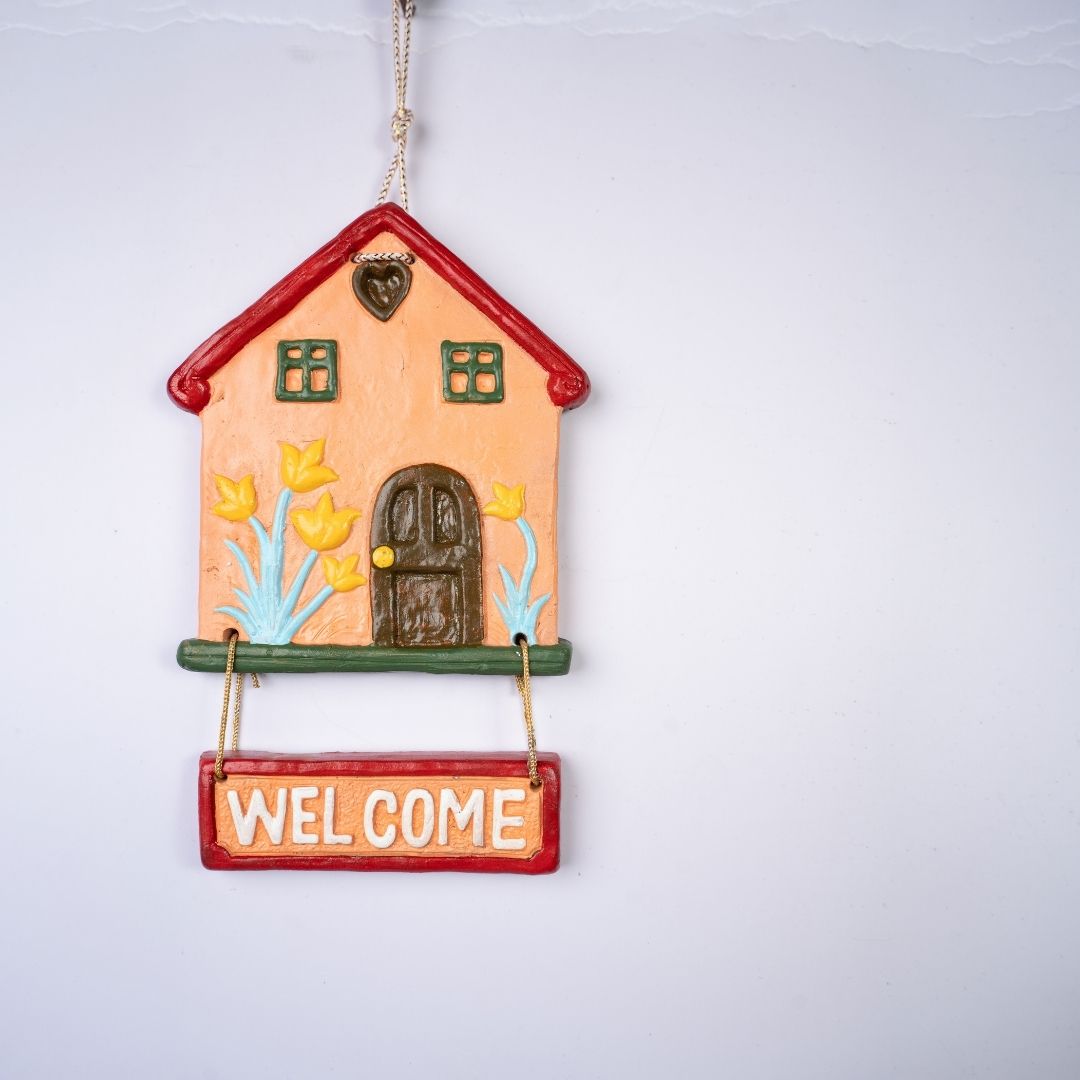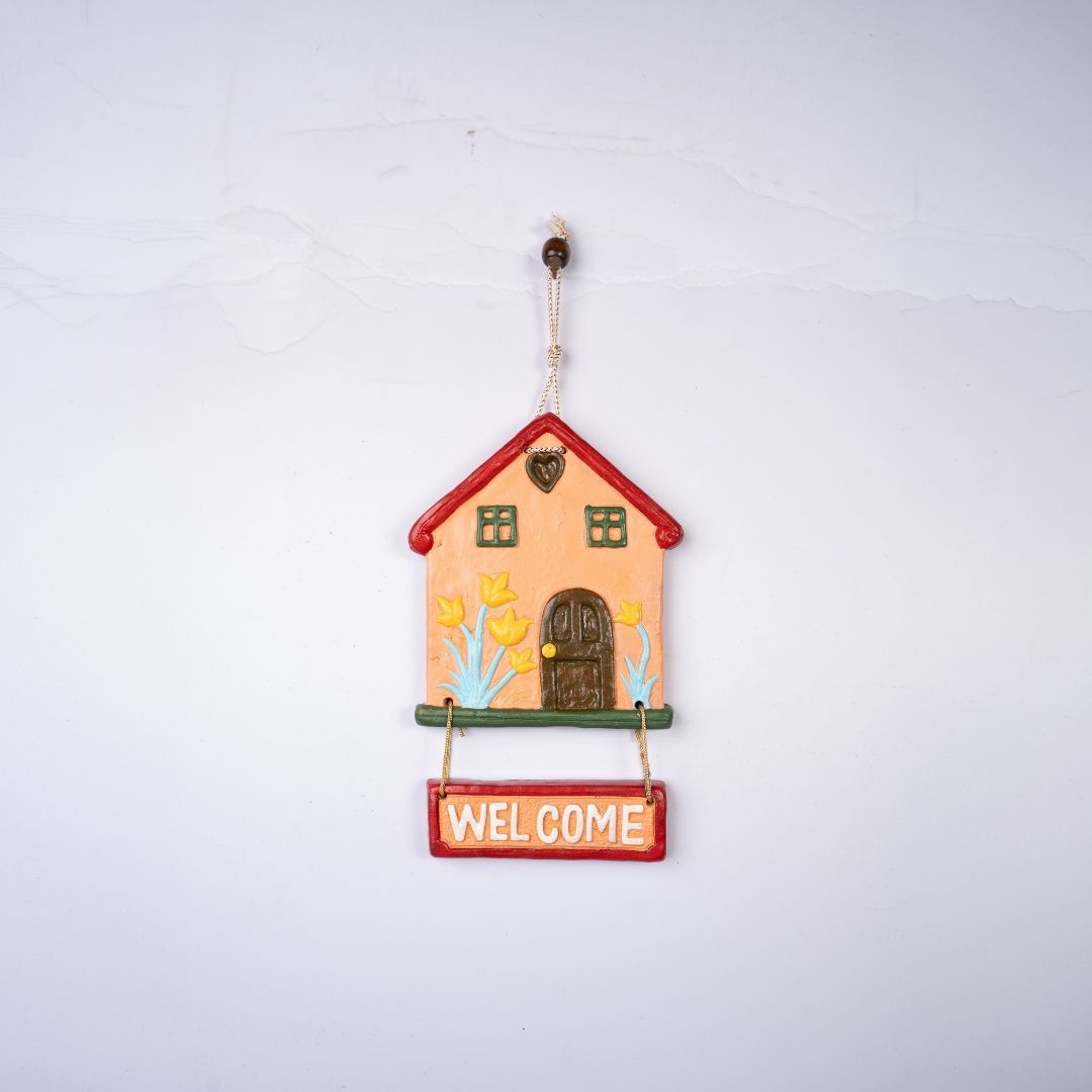 The plaque takes the charming shape of a miniature hut with a peaked, bold red roof. The walls are finished in a warm peach hue, beautifully contrasted by two green-framed windows and a detailed brown door. Hanging below the house is a rectangular sign that spells out “”WELCOME”” in crisp white, suspended by rustic cords that add a tactile, handmade feel.