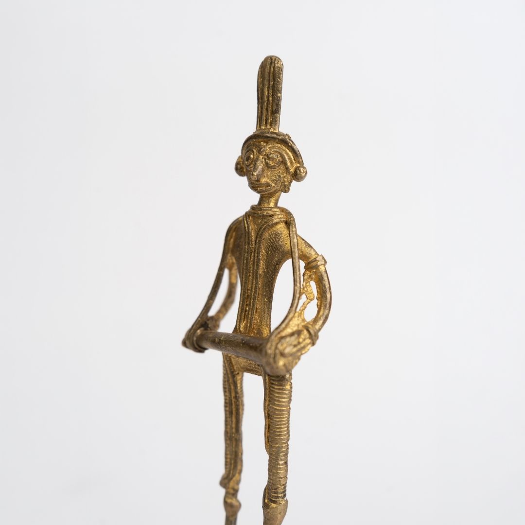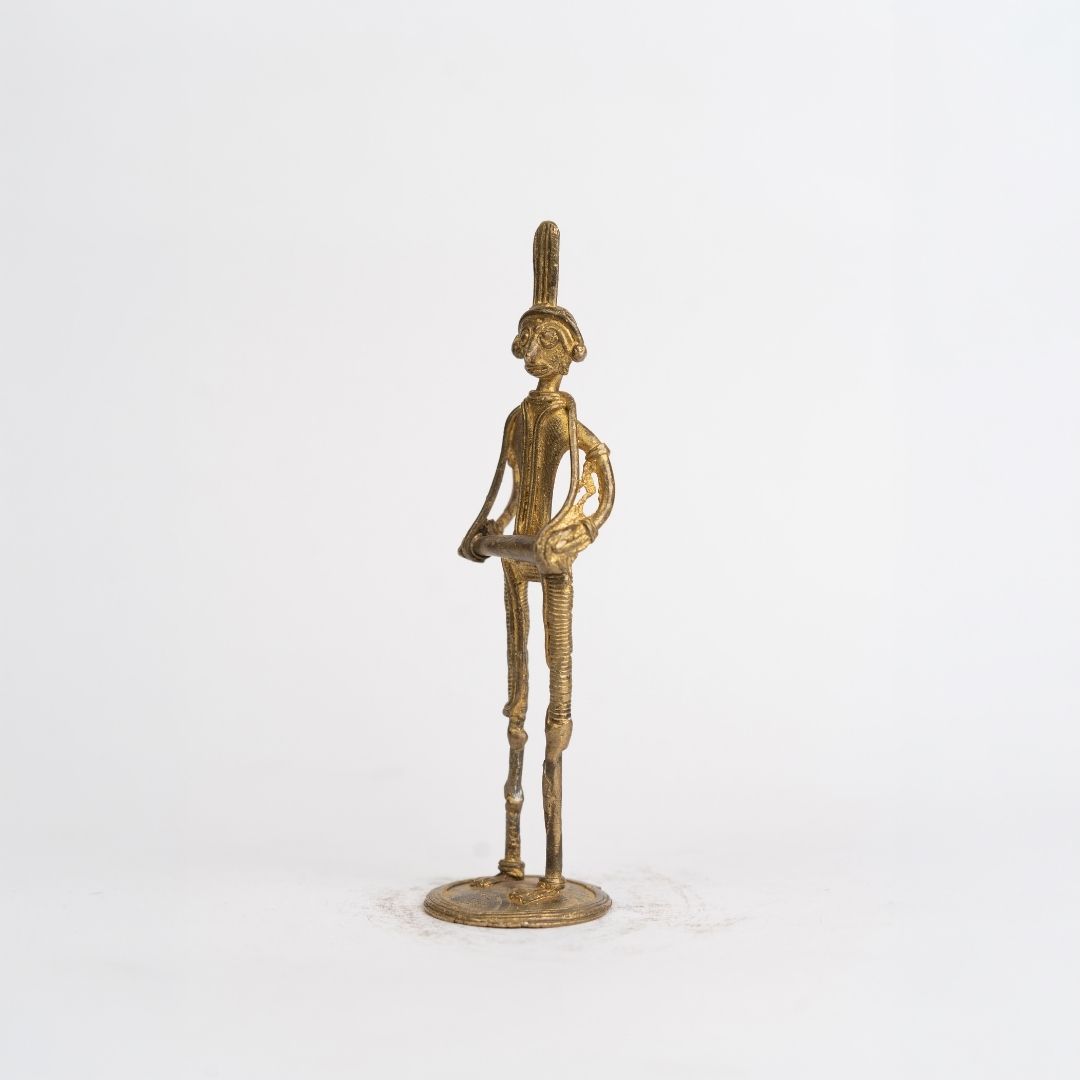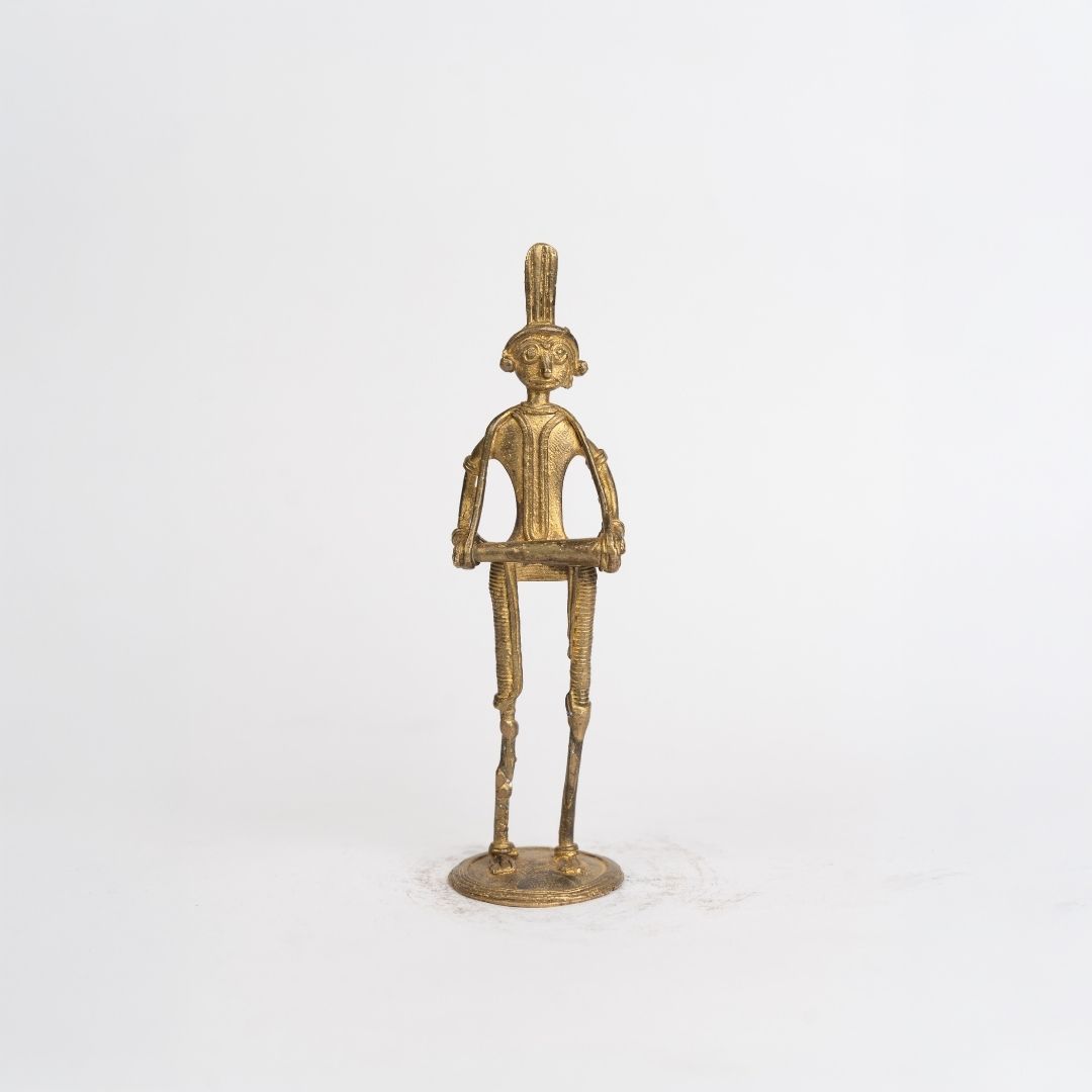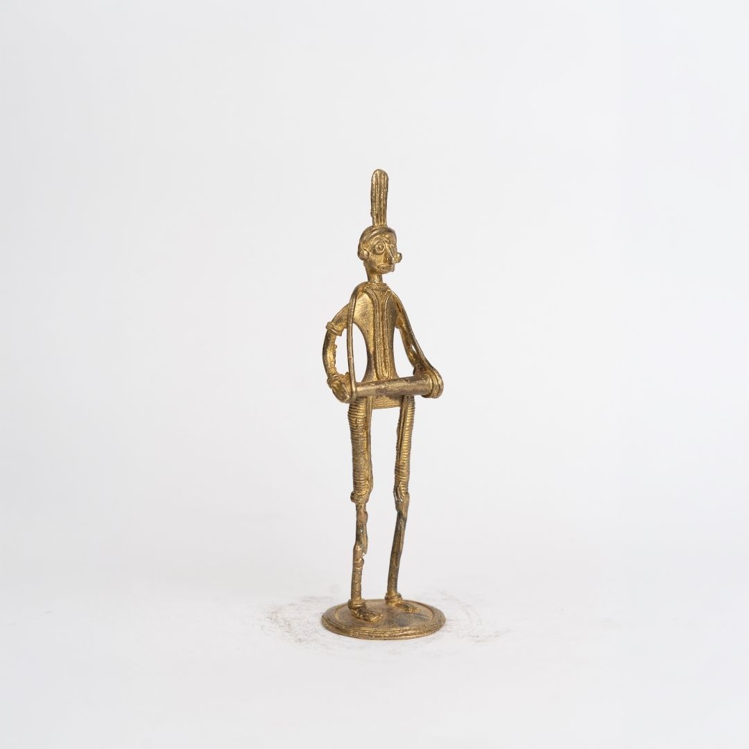 Originating from Bishnupur, this figurine reflects the centuries-old Dokra metalwork tradition of Bengal. Bishnupur artisans have long preserved the lost-wax casting technique, creating pieces inspired by tribal life, rituals, and rural celebrations. The drum player represents the musical and cultural heartbeat of Bengal’s indigenous communities, linking art with everyday life and heritage.