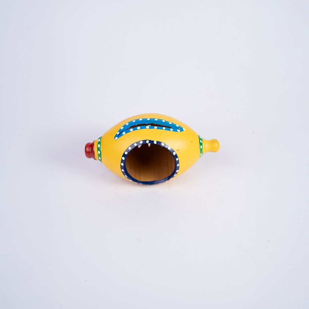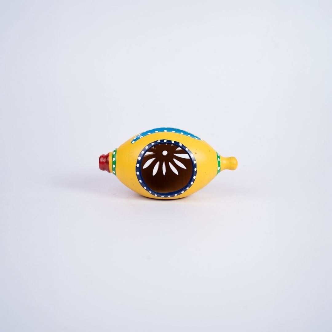 Dressed in a sun-bright yellow with a bold cobalt-blue medallion, the vessel is a vibrant festival of color. Delicate green and red accents frame the tapered ends, while meticulous hand-painted white dots create a shimmering texture. Every brushstroke is an intentional act of joy, celebrating the soulful heartbeat of authentic tribal art.