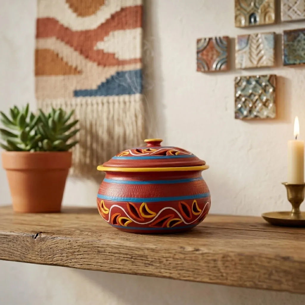 The true magic lies in the hand-carved leaf-shaped jaali cutouts that grace both the lid and body. These windows allow the clay to breathe, making it a perfect decorative accent. Every brushstroke is an intentional act of love, inviting a heartbeat of authentic artisan soul into your daily rituals.”