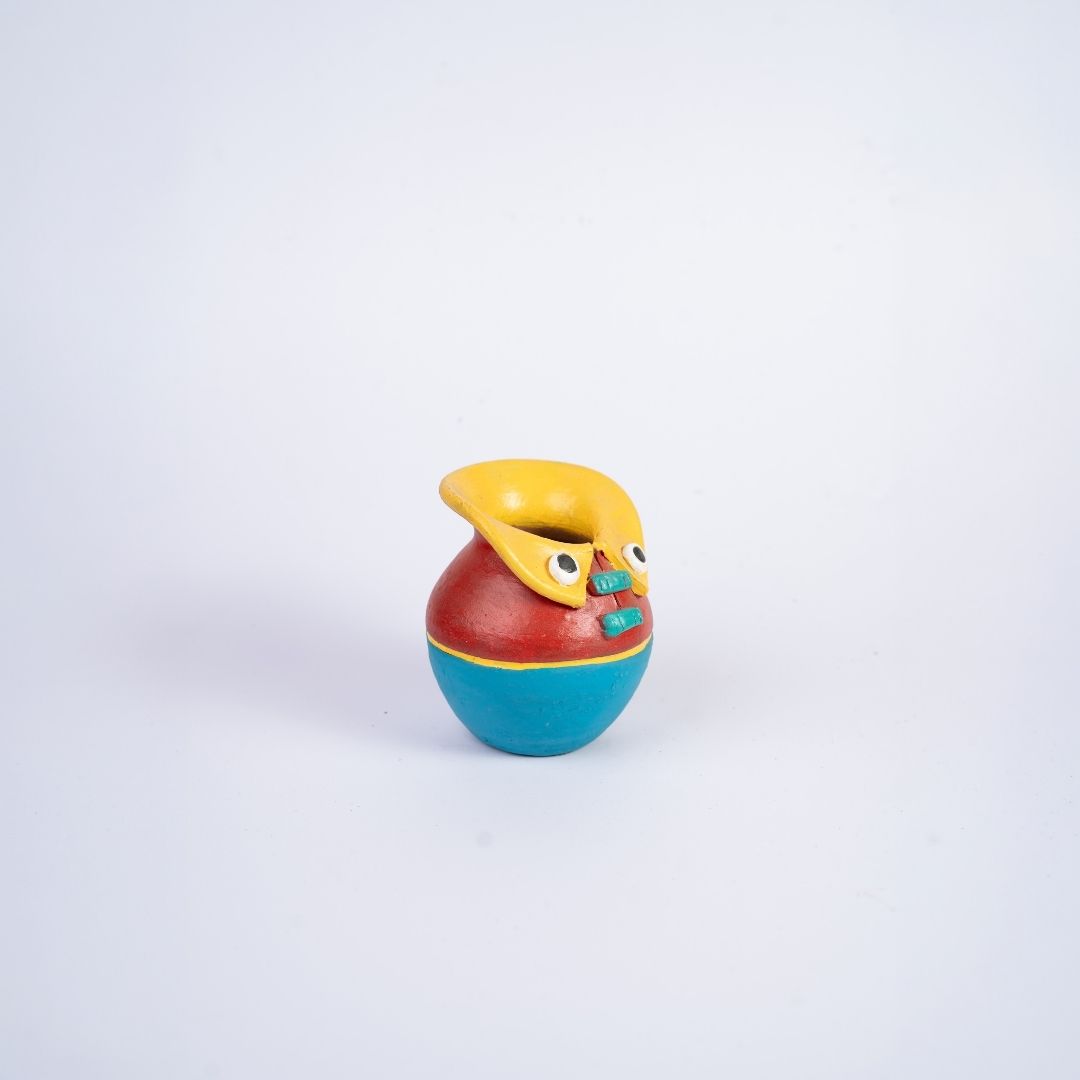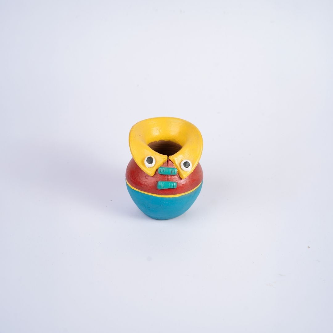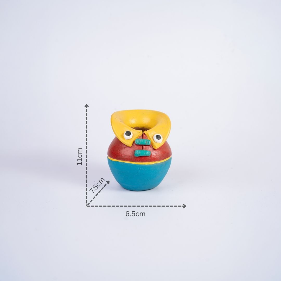 “This spirited piece begins as raw clay, spun on a traditional wheel into a bulbous, matki-inspired silhouette with a gracefully tapered base. It isn’t just a vessel; it is a silent, quirky storyteller born from the steady hands and creative imagination of a village artisan.