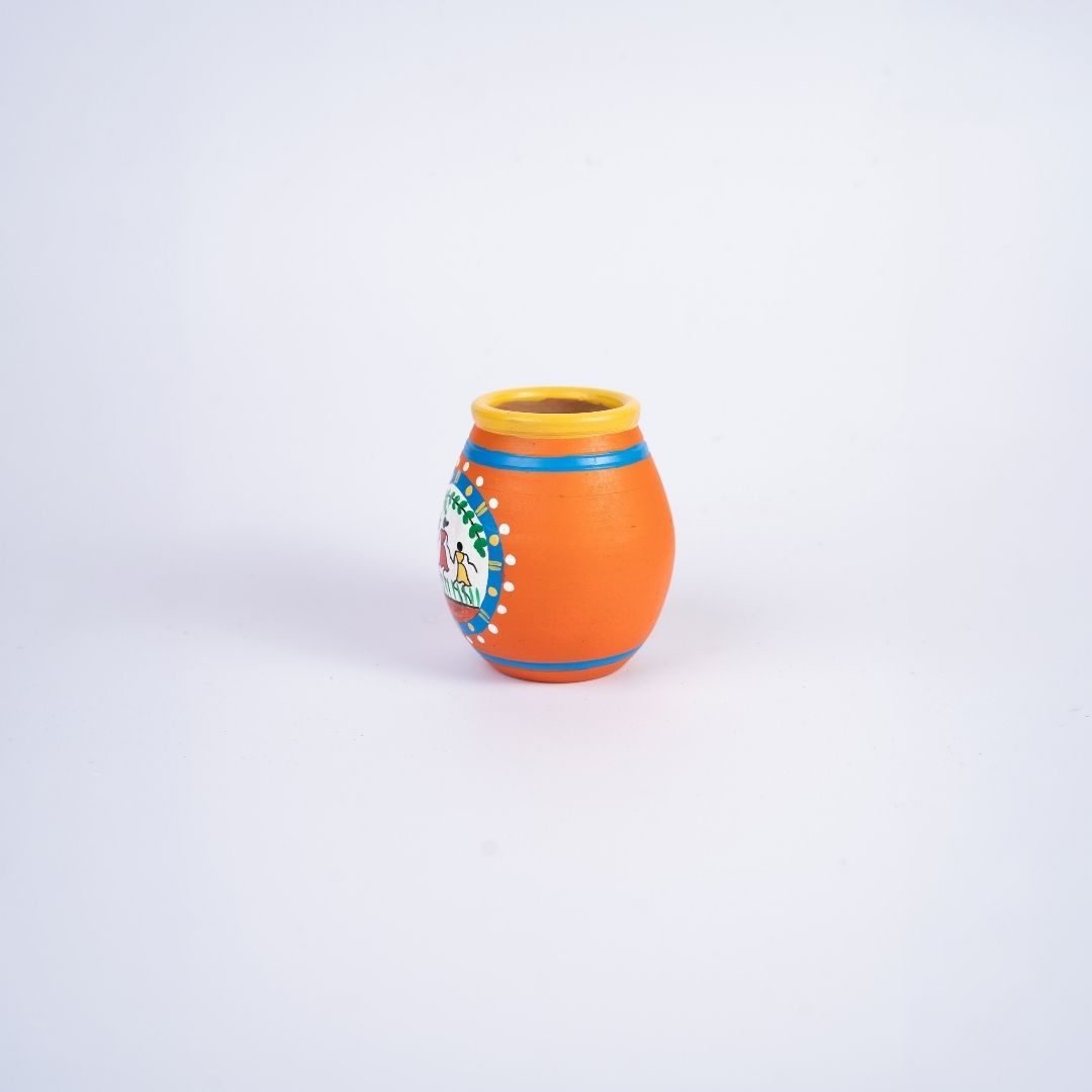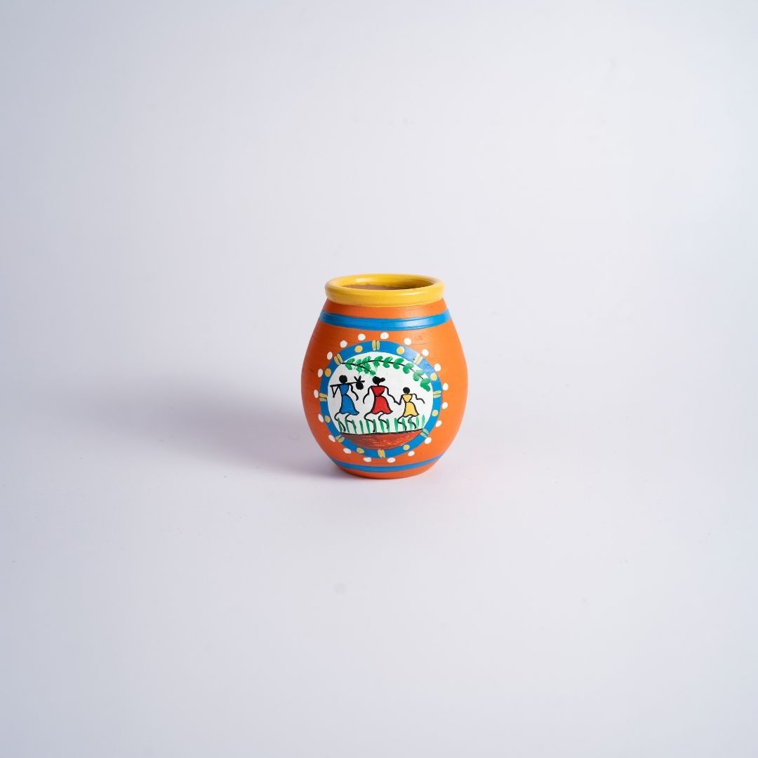 Dressed in a radiant orange hue, the pot is crowned with a bold yellow rim and accented by vibrant blue bands. The central medallion serves as a window into the past, featuring hand-painted Warli figures in festive red, blue, and yellow. These dancing silhouettes, framed by delicate white dots, celebrate the timeless harmony of village life and the beauty of human connection.