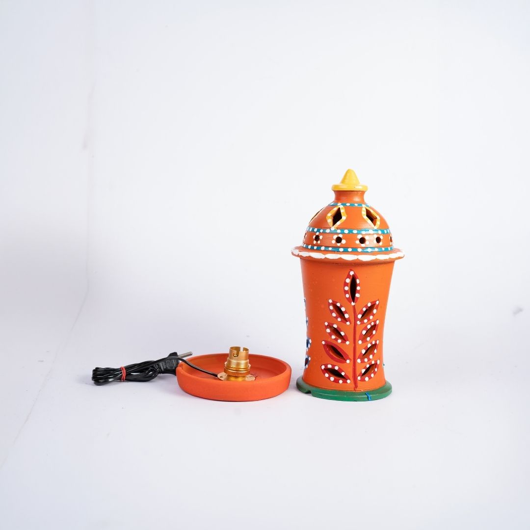 Bathed in a vibrant matte orange, the lamp is a festival of color. A sunshine-yellow finial crowns the piece, while rhythmic turquoise bands and delicate white-dotted borders wrap around the lid. Hand-painted red and white leaf patterns crawl up the sides, mirroring the lush landscapes that inspire the artisan’s steady, creative hand.