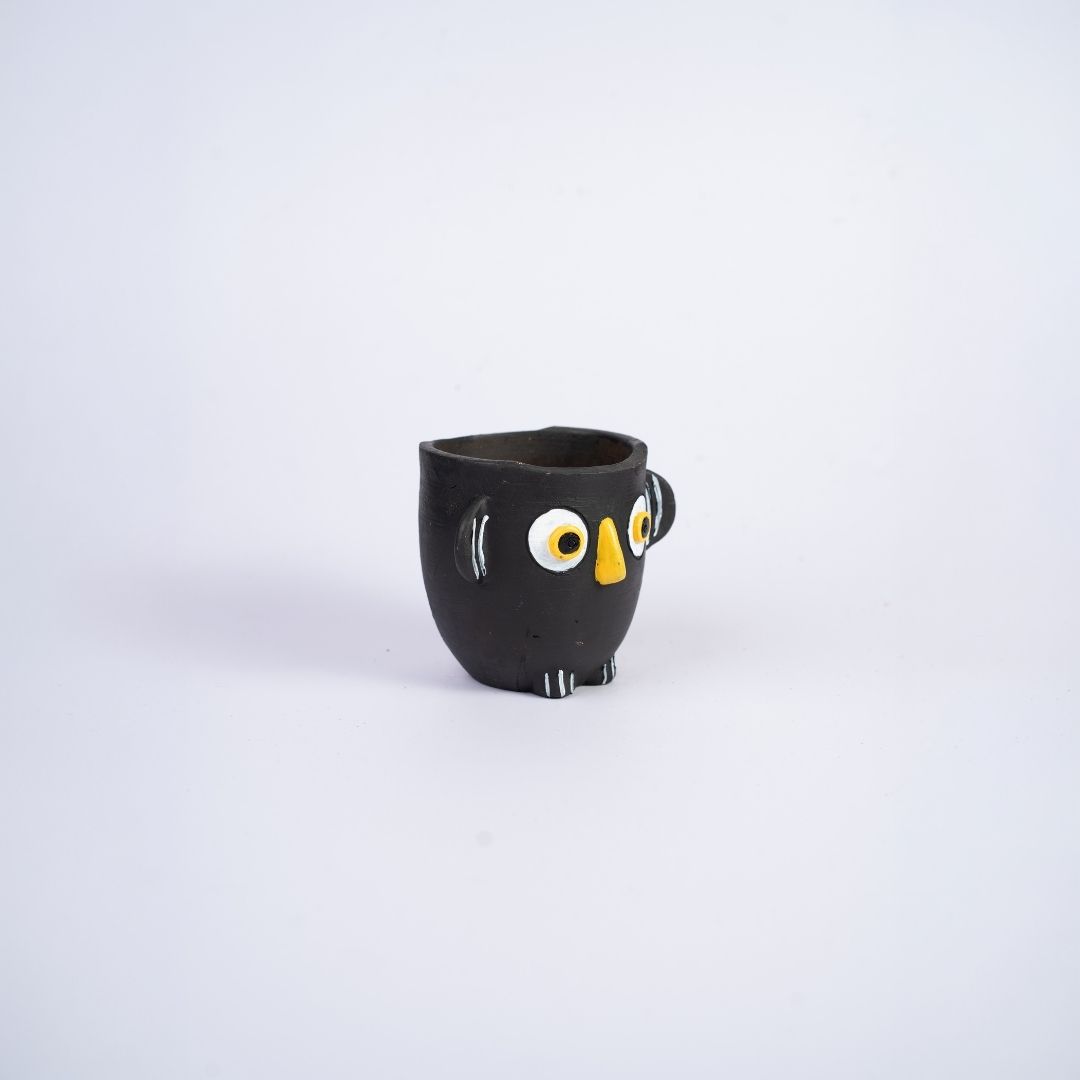 Invite a silent guardian to your desk with this matte black terracotta owl pot. Its rounded, bulbous silhouette is hand-molded with tiny ears and petite feet. Featuring a vivid yellow beak and wide, soulful eyes, this artisan-crafted character brings a heartbeat of handcrafted mystery and playful charm to your modern sanctuary.