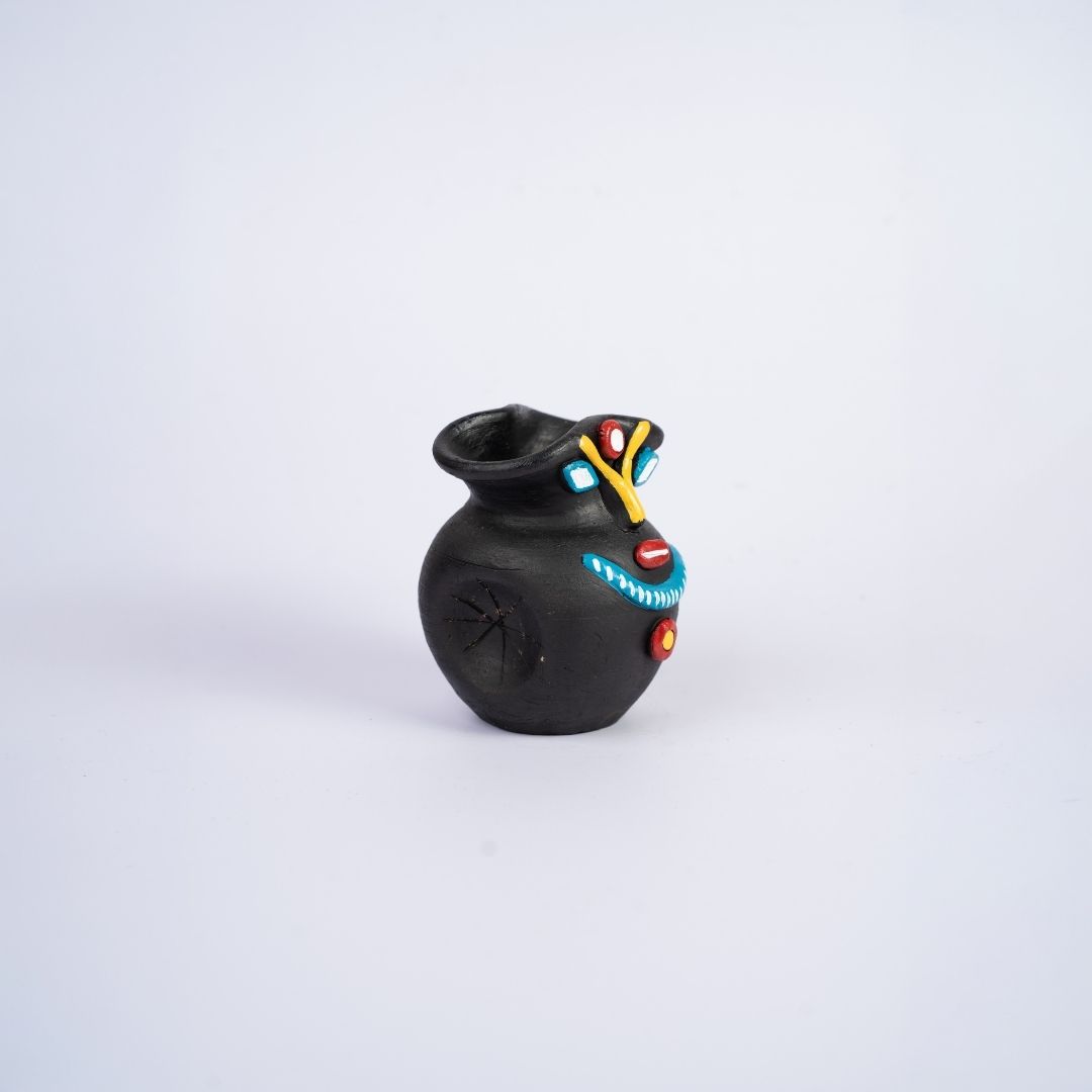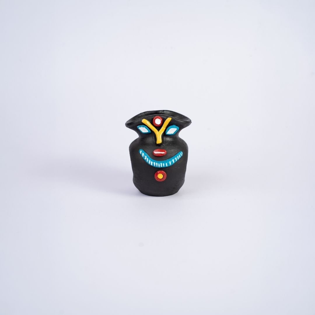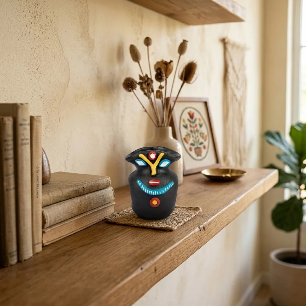 Add a dash of whimsical mystery to your decor with this matte black terracotta face pot. Hand-shaped into a bulbous matka silhouette with a flared crown, its vibrant yellow and turquoise features are painted with artisan soul. This expressive character brings a playful, handcrafted heartbeat to your modern sanctuary.
