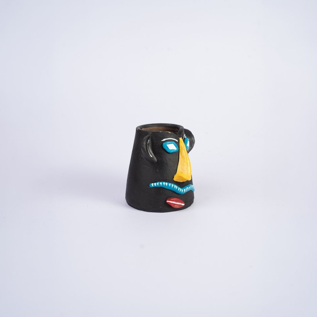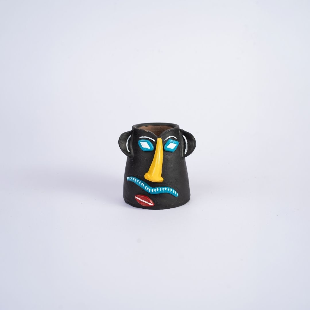 Bathed in a deep, velvety black, the pot serves as a midnight canvas for its vivid features. A long, sunshine-yellow nose projects forward, flanked by diamond-shaped eyes in brilliant blue and white. Every brushstroke is an intentional act of artistry, designed to catch the light and the eye of anyone who enters the room.