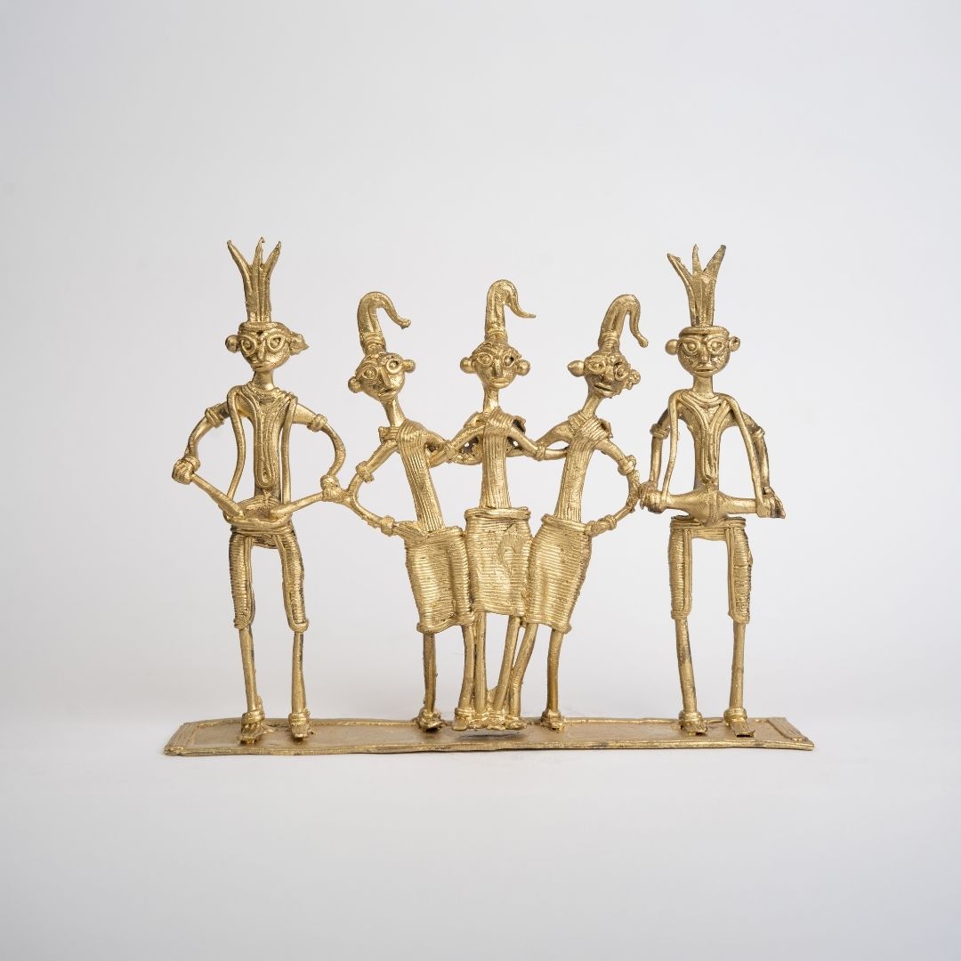 Originating from Bishnupur, this piece is rooted in Bengal’s centuries-old Dokra metalwork tradition. Bishnupur artisans have preserved the lost-wax technique for generations, crafting figurines inspired by mythology, rural life, and tribal culture. The depiction of Adivashi dancers celebrates the festivals, rituals, and communal spirit of Bengal’s indigenous communities, blending folk narrative with masterful craftsmanship.