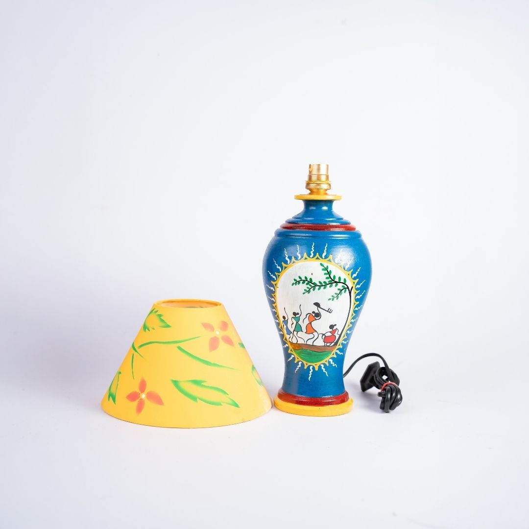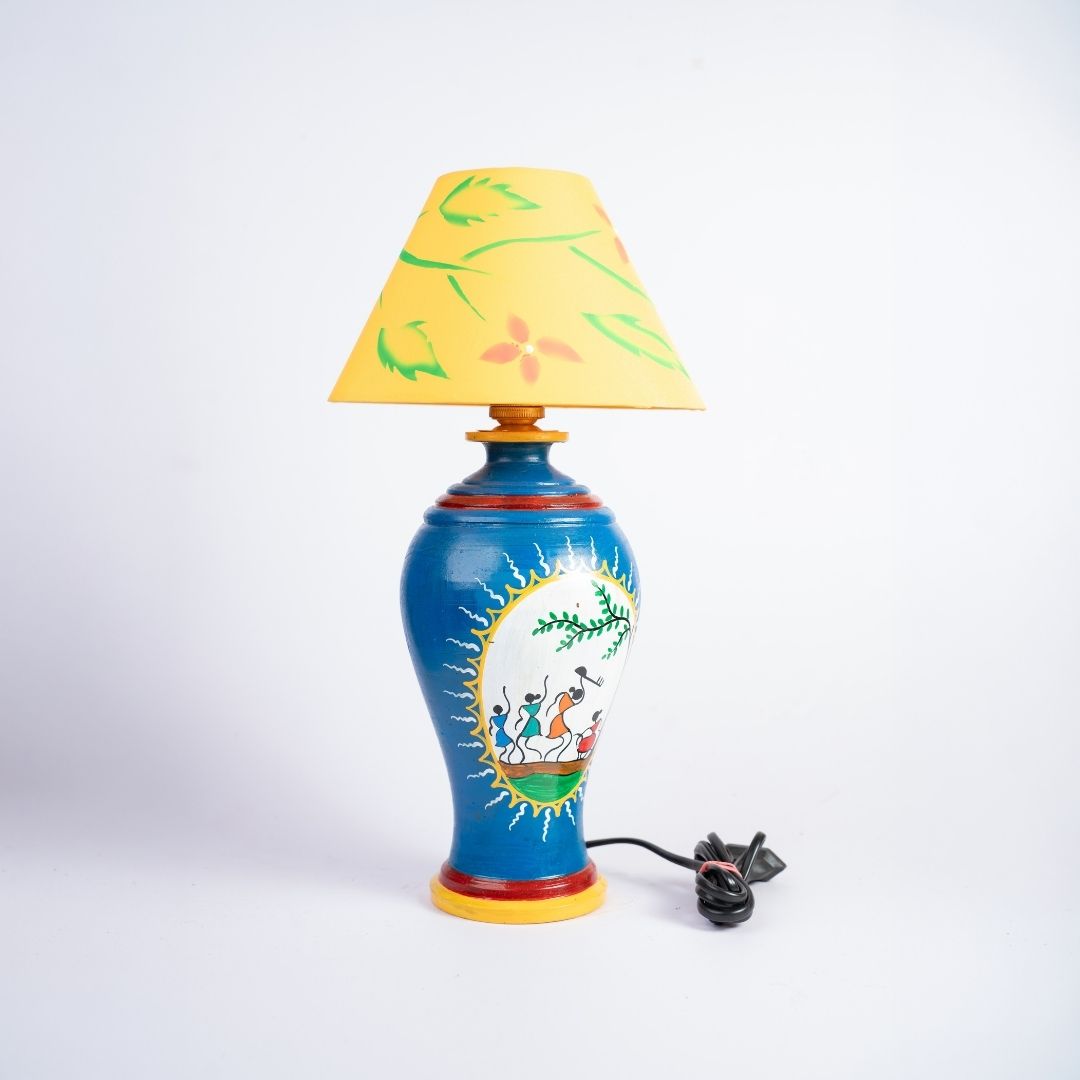Illuminate your sanctuary with this soulful cerulean blue terracotta lamp. Hand-molded into a graceful urn silhouette, its base showcases vibrant Warli folk art within a sunburst medallion. Topped with a sunny yellow floral shade, this artisan-crafted piece is a rhythmic celebration of ancient heritage and warm, human-made light.