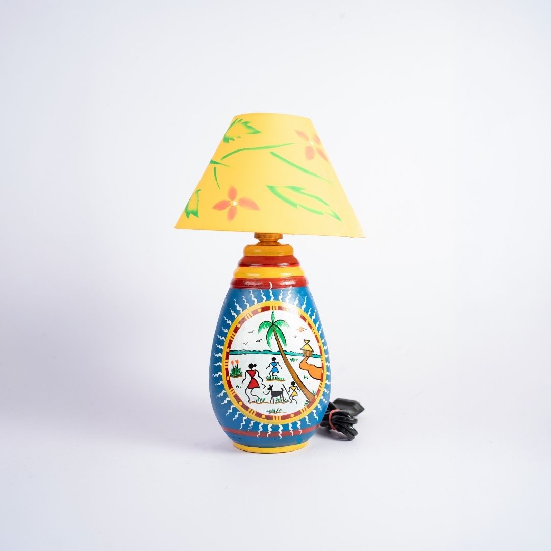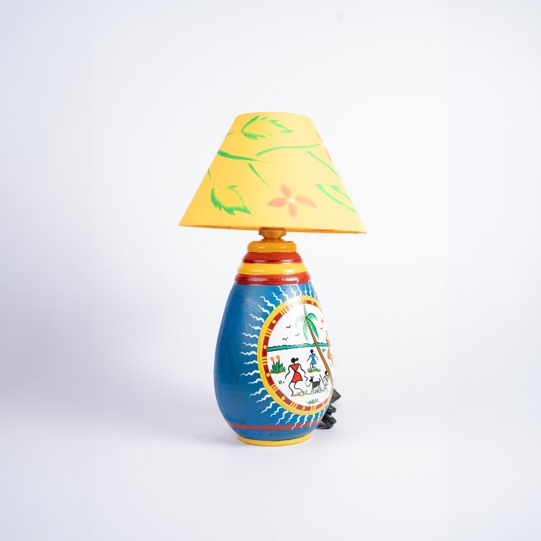 Bathed in a rich sky blue, the base is a vibrant stage for tribal tradition. Geometric yellow and red bands frame a central Warli medallion, where hand-painted figures and a swaying palm tree tell stories of village harmony. Delicate white-zigzag patterns add a sense of movement, capturing the colorful heartbeat of rural craftsmanship.